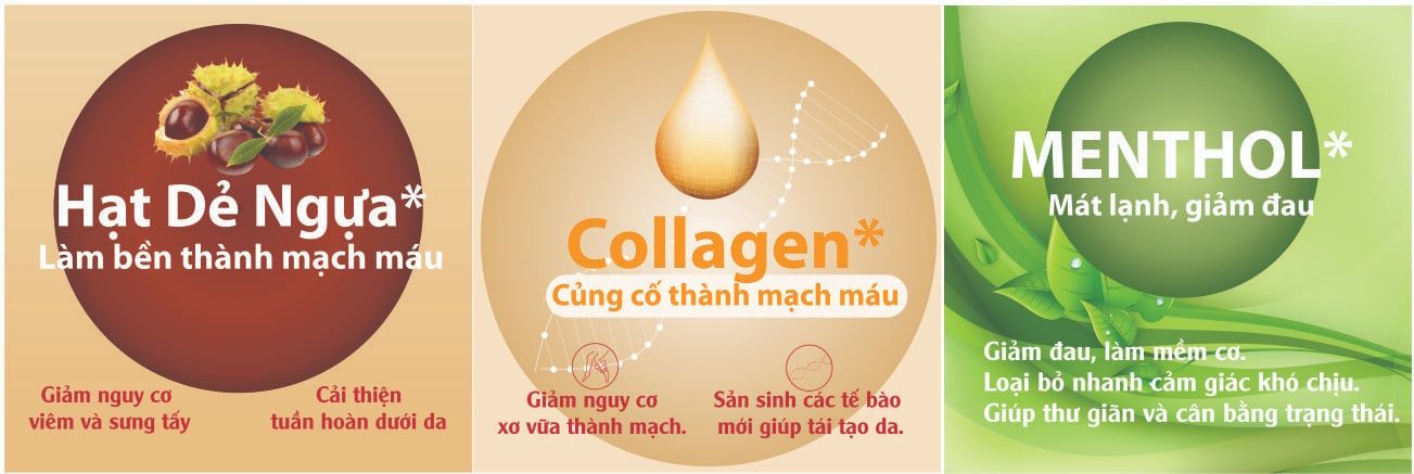 1. Aesculus hippocastanum L. (Chiết xuất Hạt Dẻ ngựa): giàu các flavanoid đặc biệt là escin và esculin, saponin, tannin, đường, sterol và khoáng chất. Giảm độ giòn, củng cố thành mạch máu, làm thành mạch máu trở nên ít nứt vỡ, linh hoạt hơn. Cải thiện tuần hoàn dưới da. Giảm thiểu nguy cơ viêm và sưng tấy.