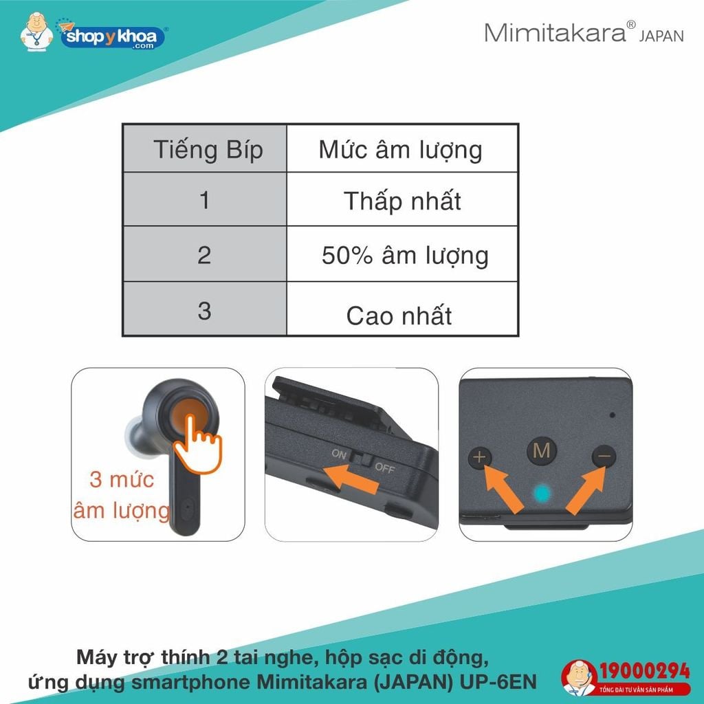 Sau khi đeo máy trợ thính T3 vào tai, bạn có thể chuyển đổi giữa 3 mức âm lượng để phù hợp với nhu cầu của mình bằng cách chạm vào nút điều chỉnh trên máy.