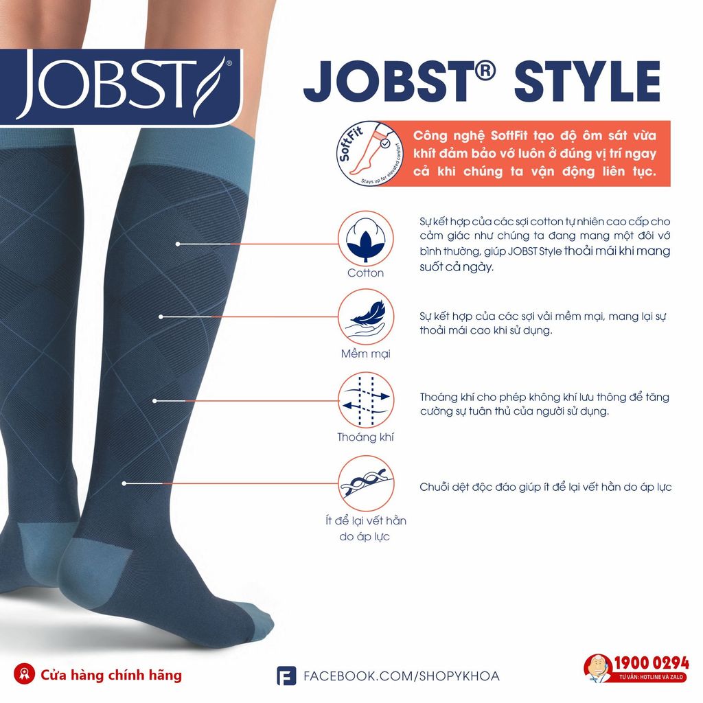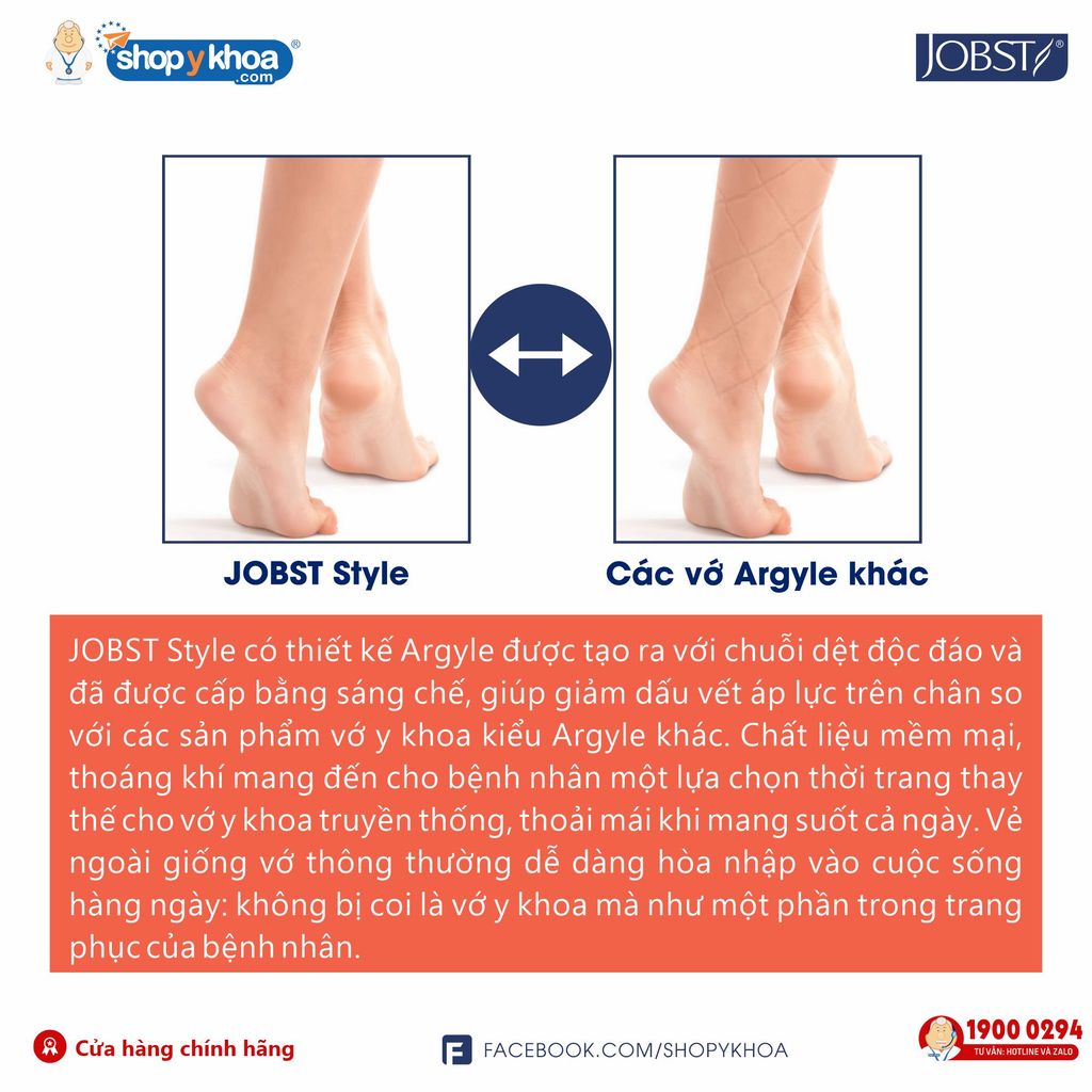 JOBST Style có thiết kế Argyle được tạo ra với chuỗi dệt độc đáo và đã được cấp bằng sáng chế, giúp giảm dấu vết áp lực trên chân so với các sản phẩm tất nén kiểu Argyle khác. Chất liệu mềm mại, thoáng khí mang đến cho bệnh nhân một lựa chọn thời trang thay thế cho vớ nén truyền thống, thoải mái khi mang suốt cả ngày. Vẻ ngoài giống vớ thông thường dễ dàng hòa nhập vào cuộc sống hàng ngày: không bị coi là vớ y khoa mà như một phần trong trang phục của bệnh nhân.